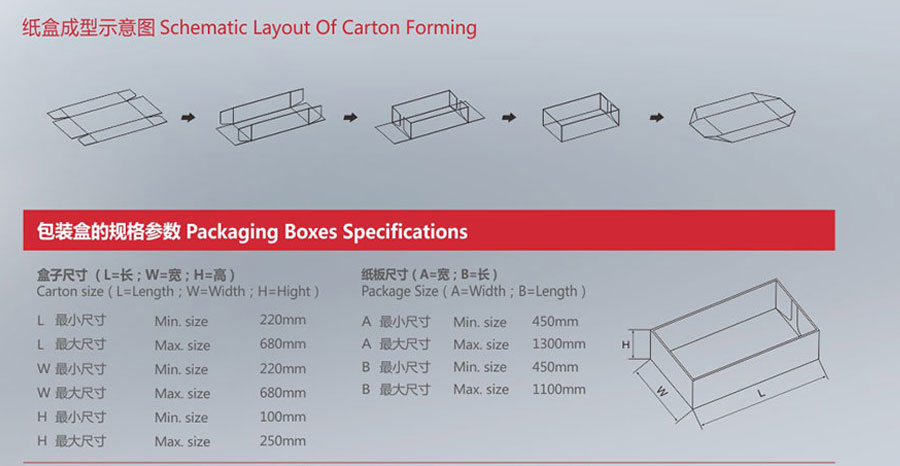 該機器主要用於天地蓋包裝紙盒的生產(chǎn)加工,適用食品包裝盒,水果、蔬菜包裝機等需要包裝的產品盒類的加(jiā)工(gōng)製。